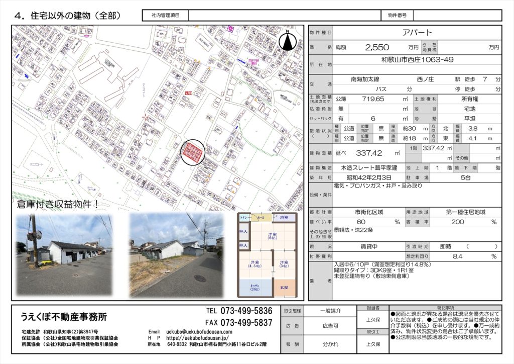 | 特記事項 | 入居中6/10戸 満室想定14.8% 倉庫未登記 | ||